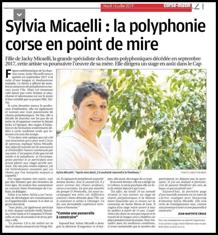 Jacky Micaelli, artiste reconnue et figure emblématique du chant corse et notamment de la polyphonie corse sacrée et profane, nous a quitté en septembre 2017, nous laissant en héritage son patrimoine culturel, musical et artistique.